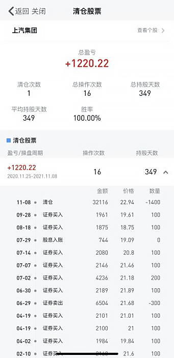 “2021年11月8日,我以22.94元/股清仓的时候总金额大概3万多元,断断续续补仓补了13次,因为中途‘割肉’卖过一点,所以只赚了1200多元。现在回顾来看,我当时建仓真的是买在高点了,没想到28元多的股价就已经是上汽这两年的高光时刻。如果同期买卖的是比亚迪,就算只买一手股票至少也能赚12000元。”林佳说。
