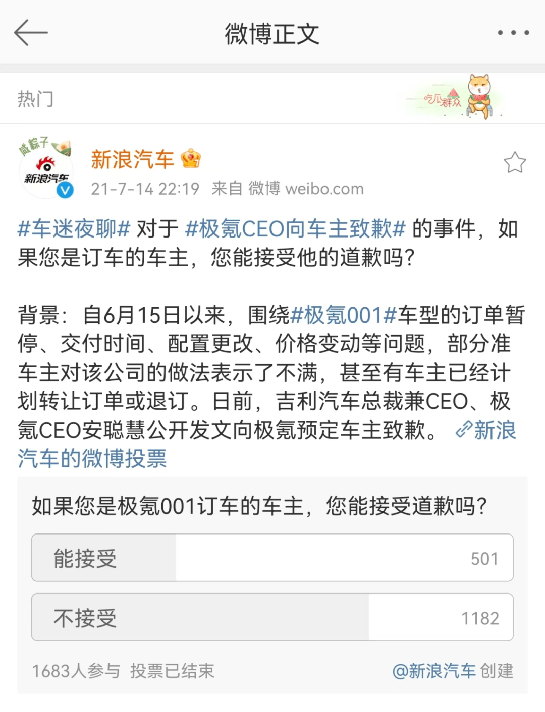 对此,新浪汽车微博还做了一个“是否能接受致歉”的公开投票。从投票的结果看,1683的票数中“能接受”致歉的只有501人,不到投票人数的三分之一,超三分之二的人表示“不能接受”。