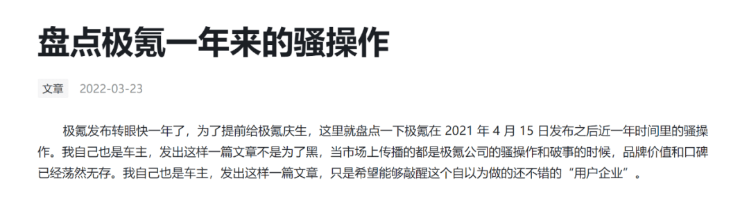 正所谓“苍蝇不叮无缝的蛋”,一个巴掌拍不响,若是不是极氪汽车在处理问题上欠妥当,也不至于被众人“诟病”。2022年3月23日,一位自称极氪001车主在网上发文《盘点极氪一年来的骚操作》,称这不是为了黑,发出这样一篇文章,只是希望能够敲醒这个自以为做得还不错的“用户企业”。