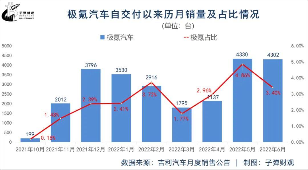 从吉利汽车刚发布的6月销量数据来看,6月吉利汽车的总销量为126595台,同比增长26%,其中,极氪汽车实现4302台的销量,占吉利总销量比值的3.40%;1-6月吉利汽车累计总销量达613842台,同比下降3%,其中,极氪汽车累计实现19010台的销量,占吉利总销量比值的3.10%。
