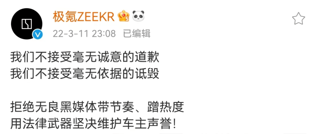 更让人没有想到的是,在极氪001开启批量交付的半年后,“看热闹不怕事儿大”的第三方媒体将极氪的负面舆论推至顶峰。2022年3月极氪这才意识到问题的严重性,在针对一个自媒体车评的过度“调侃”下,极氪终于对“无良黑媒体”抡起了法律的棒槌。