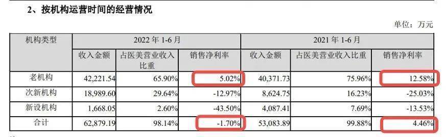 数据显示,2022年上半年,朗姿股份旗下老医美机构(指运营三年以上机构)销售净利率从去年同期的12.58%,下降至5.02%,而这部分老机构贡献了医美板块近7成的收入。