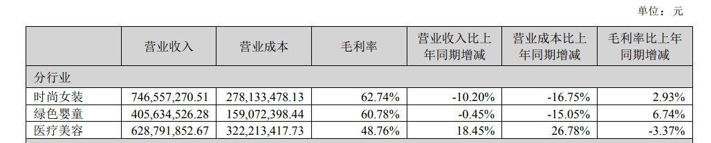 2022年上半年,朗姿股份旗下医美业务板块,与女装、童装业务板块走势,呈现截然相反的态势:医美业务营收增长、成本上升及毛利润下降;女装、童装业务则呈现出营收下跌、成本下跌和毛利润上升。