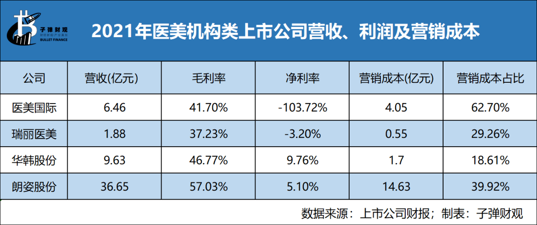根据公开信息,医美国际、瑞丽医美、华韩股份等以终端医美机构业务为主的企业,营销成本往往占据营收较大份额,亏损与薄利更是常态。以医美国际为例,2021年营销成本占比高达62.7%。