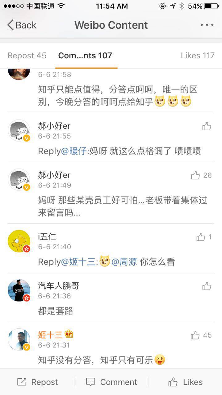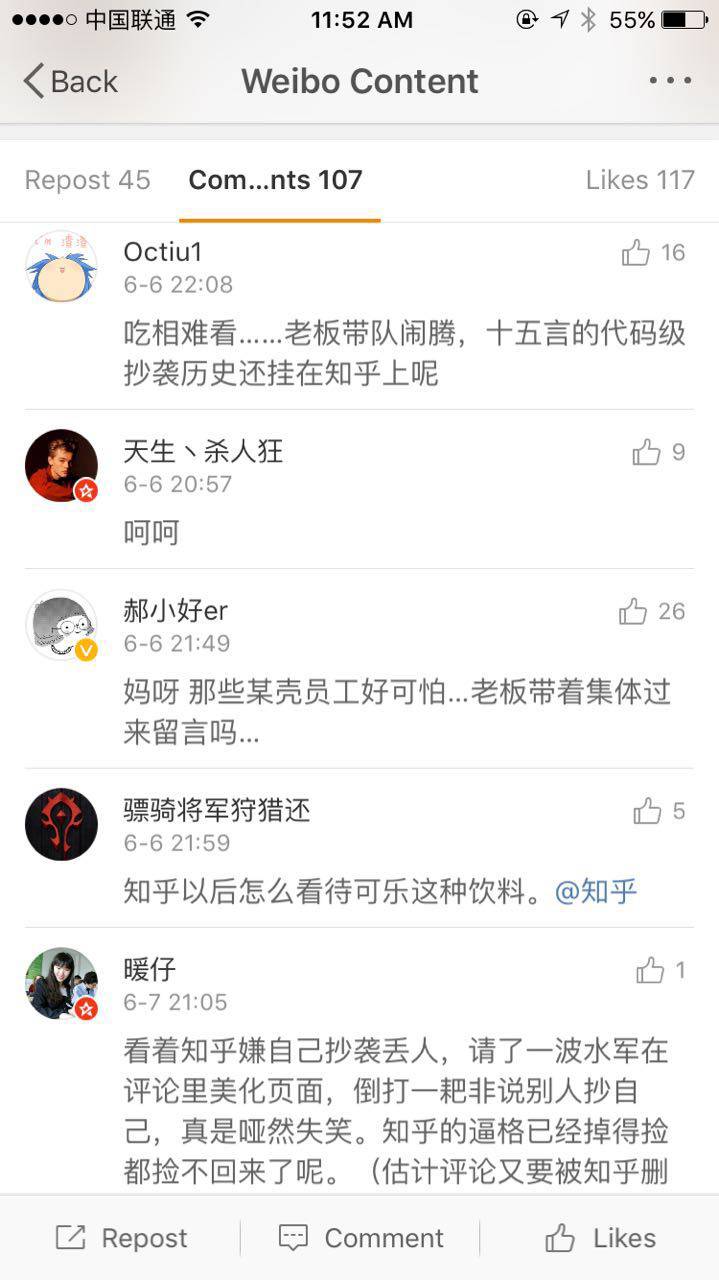 在值乎推出当天,知乎的微博被姬十三及其它果壳员工“轮”了一遍,大意是知乎居然抄袭分答,看我们火了眼红了,吃相太难看。