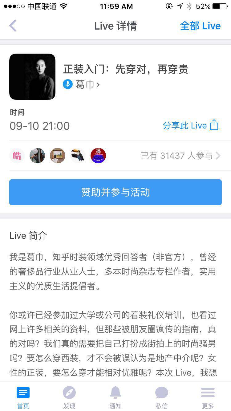 的而知乎Live的单场最高纪录则由知乎时尚方面的著名用户葛巾创造,她的《正装入门:先穿对,再穿贵》吸引了3万人报名,收入高达15万。
