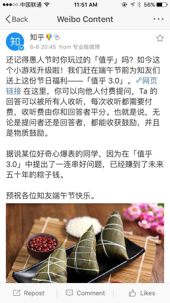 知乎创始人、CEO周源发表了一个视频,告知大家知乎在4月1日愚人节上线了一款只存在一天的新产品,用户关注知乎公众号后可以在微信朋友圈里分享自己的打码信息,而其他人必须付费才能看到,付费后觉得满意钱就归作者,不满意钱就归知乎官方。至于名字么,就叫值乎。