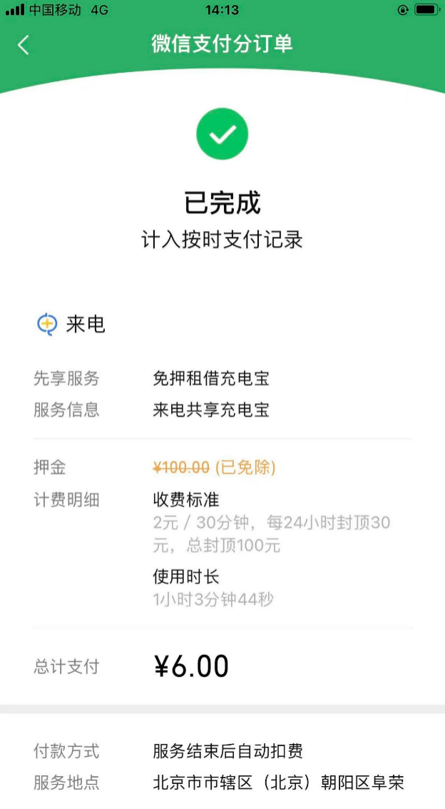 最近,在望京小街用餐的刘凡在店内借了一个共享充电宝,等吃完归还时,显示用时1小时3分钟,收费6元。根据计价规则,哪怕只超时1秒,也要按30分钟内收费。