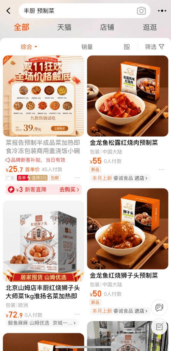 在淘宝平台搜索“金龙鱼 预制菜”关键词,并未有相关结果,而搜索“丰厨 预制菜”,仅出现了9条搜索结果,包括金龙鱼松露红烧肉、红烧狮子头、土豆炖牛腩等预制菜品。