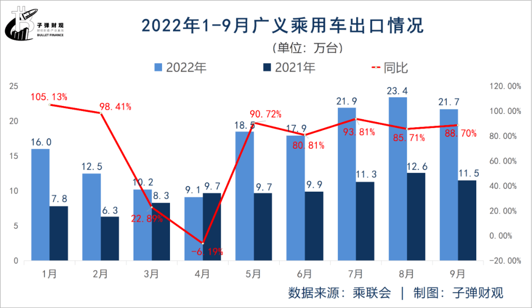 同时,「子弹财观」从乘联会数据获悉:2022年三季度中国广义乘用车出口量达67.0万台,相比于上年同期净增加35.4万台,同比增长89.27%,并在8月以23.4万台的出口量创下历史新高。