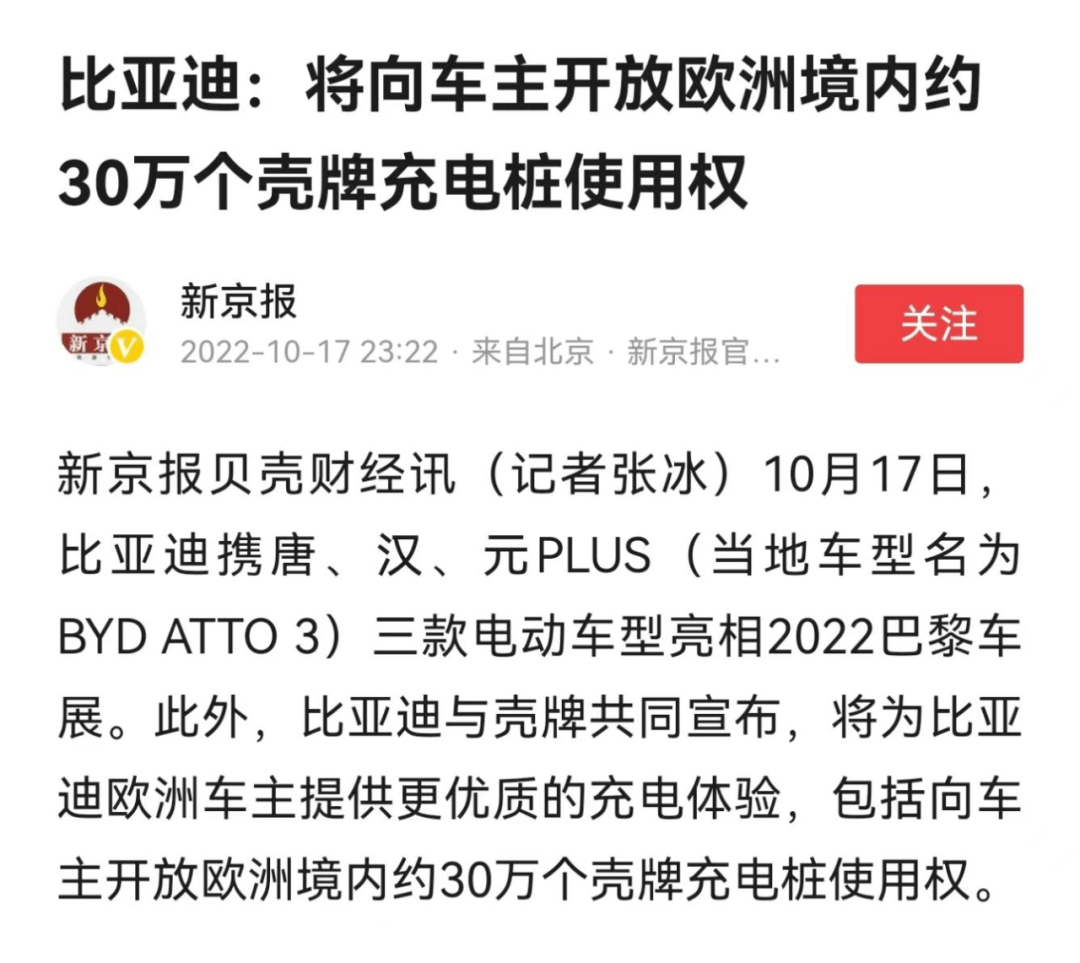 早在今年3月,比亚迪就曾与壳牌签订了全球战略合作协议。双方将在中国和欧洲开启充电桩的合作,并计划将这一合作关系扩展到全球。如今,小半年时间过去了,终于在10月17日的巴黎车展上,比亚迪和壳牌共同宣布,将向车主开放欧洲境内的30万个壳牌充电桩的使用权。