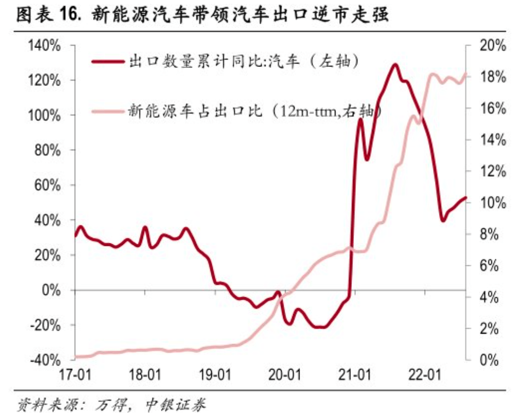 中国新能源出海,一路走来已经有近五年的时间,中银证券的研报数据显示,截至2022年上半年,中国的新能源汽车出口销量占总销量的比例已经稳在了18%,这一点和中汽协的前三季度出口基本吻合。