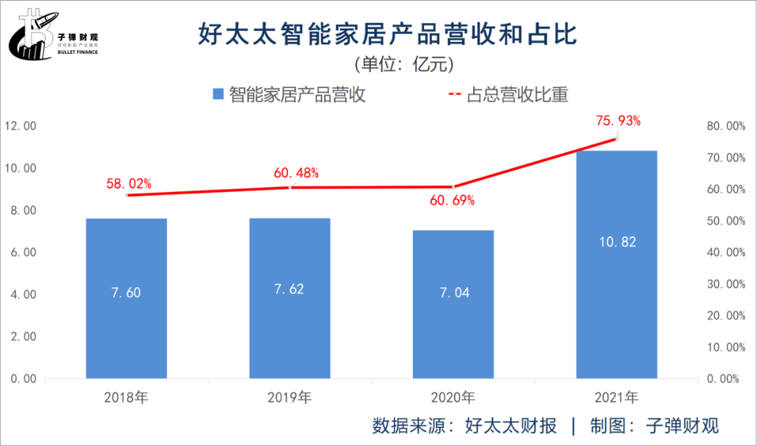客观来说,好太太由传统晾衣架厂商向智能家居企业转型还算成功。根据已公开的财报,2018年好太太的智能家居产品营收为7.60亿元,占公司总营收的比重为58.02%。到了2021年,这组数据已分别为10.82亿元和75.93%。