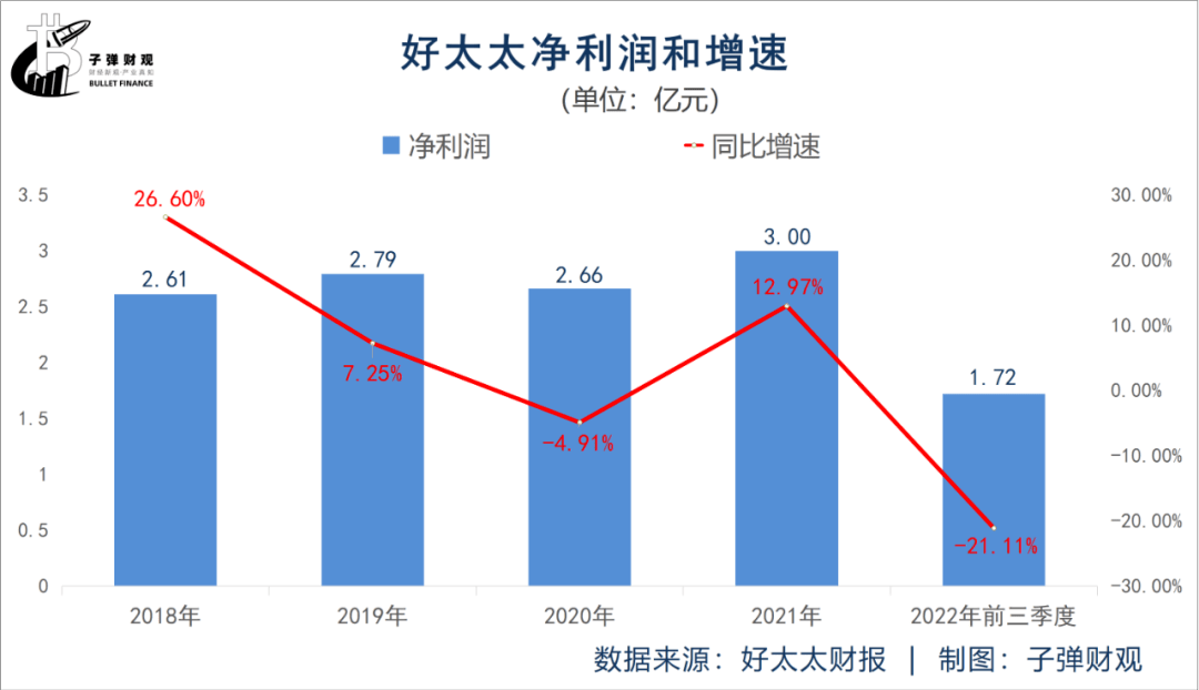根据财报,2022年前三季度好太太的净利润为1.72亿元,同比下滑超过20%,达到21.11%。