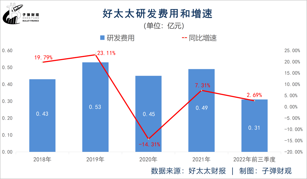 此外,好太太的研发费用同样在上升。好太太发布的财报信息显示,2022年前三季度好太太的研发费用为0.31亿元,同比增长2.69%。