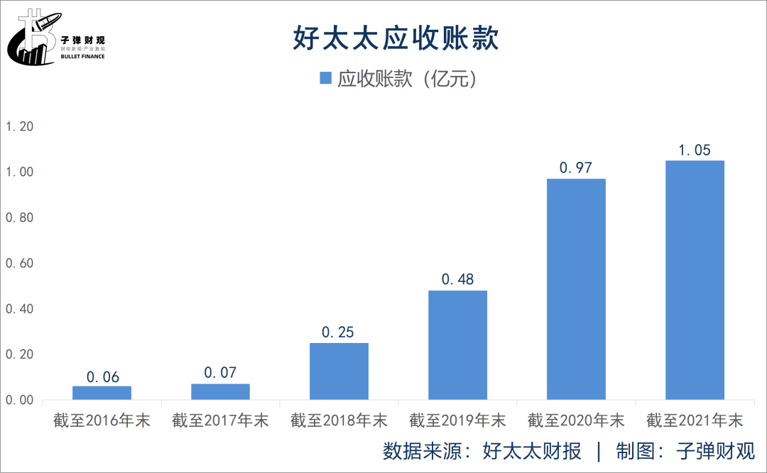 此外,好太太也面临应收账款激增的风险。好太太的财报显示,截至2016年末,该公司的应收账款仅为0.06亿元,而截至2021年末,这一数值已飙升至1.05亿元。
