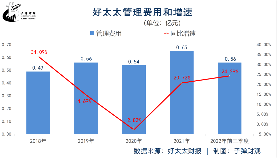 当然,增长的不止好太太的营销费用,也包括其管理费用。根据好太太此前披露的财报,2022年前三季度好太太的管理费用为0.56亿元,同比增长24.29%。