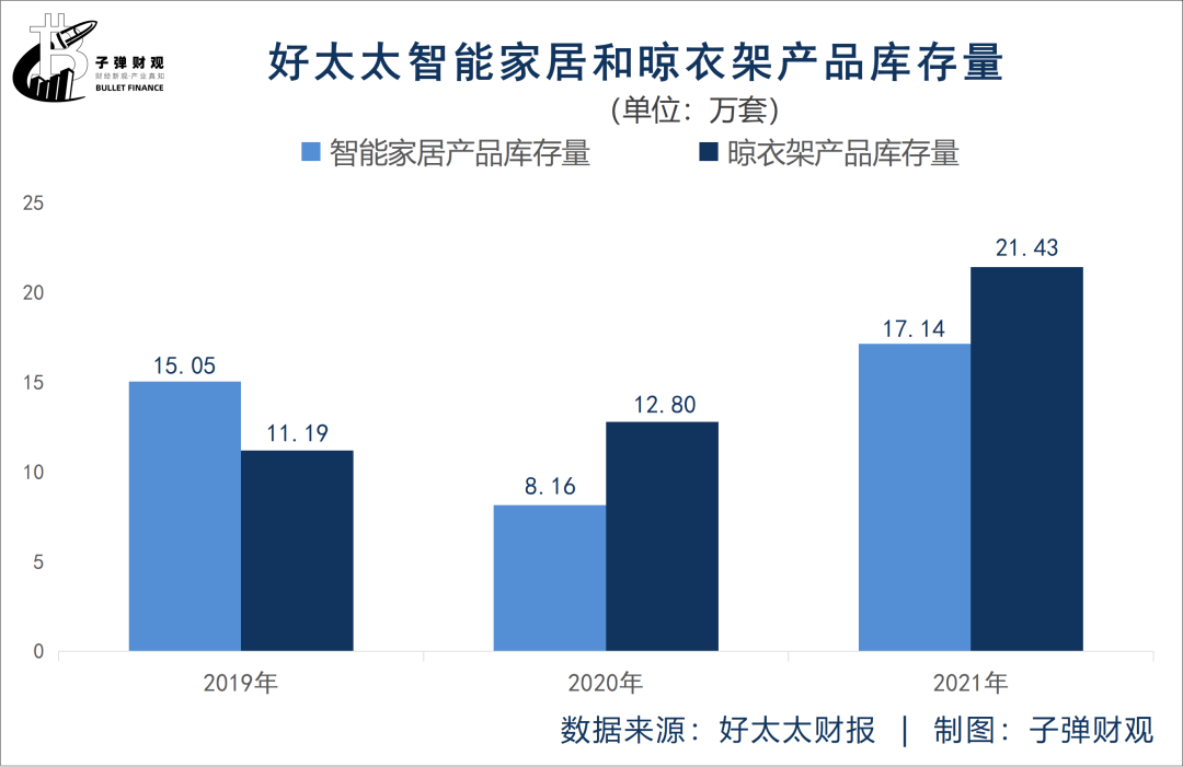 根据好太太往期财报,最近3个年度,该公司的智能家居产品库存量已由2019年的15.05万套增至2021年的17.14万套,提高了13.89%;晾衣架产品库存量则从2019年的11.19万套升至2021年的21.43万套,上涨了91.51%。