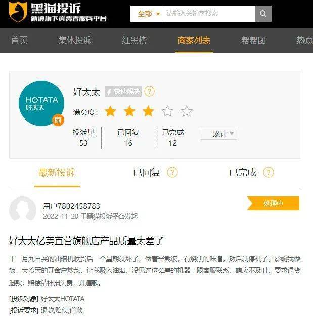 不仅如此,好太太还面临口碑信誉下滑的风险。「子弹财观」注意到,在黑猫投诉平台上,涉及好太太的投诉合计达53条,而网友们对好太太的投诉主要为产品质量差、售后服务差、虚假宣传、不发货以及不退款等。