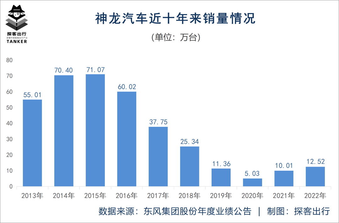 「探客出行」从东风集团股份产销数据获悉,神龙汽车在2022年的累计销量约12.52万台,同比增长25.07%。看似还不错的同比增速,若是把时间拉长来看,情况就显得不那么乐观了。