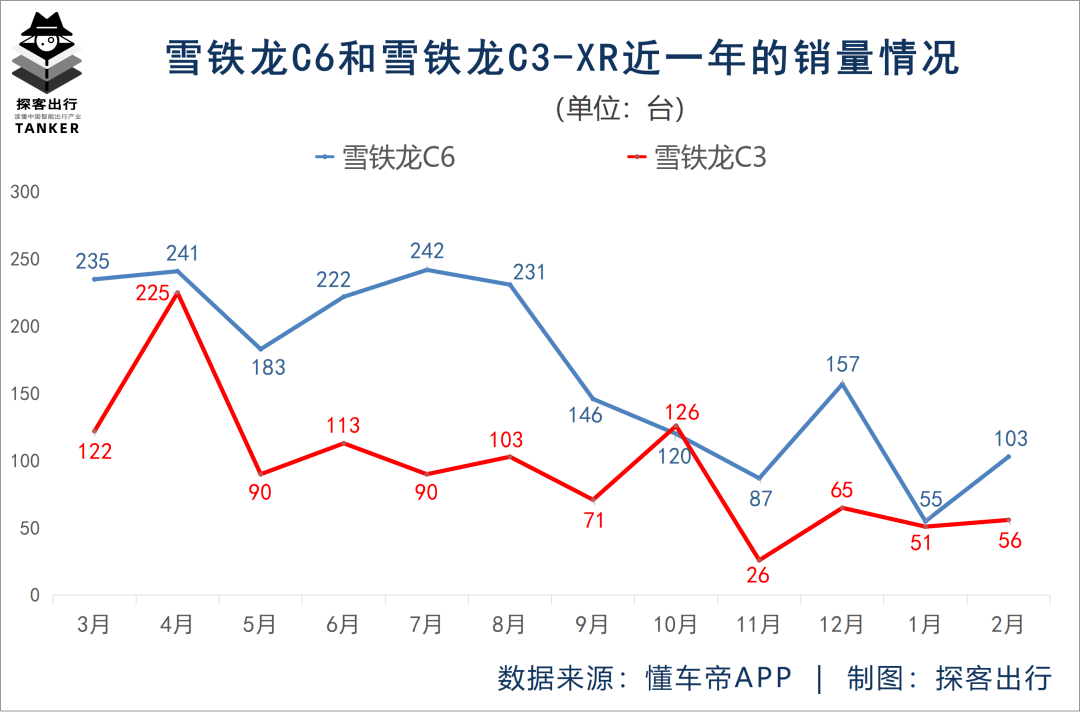 2023年2月雪铁龙C6的单月销量为103台,而在1月的仅有55台。最近一年的累计销量也才2022台,平均月销量不到170台。而另一款因降价被人关注的雪铁龙C3-XR在2月的销量低至56台,而近一年的累计销量仅1138台,月销量不足100台。