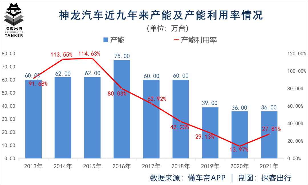 更要紧的是,神龙的产能利用率从2014和2015年的超过110%,下滑到了2020年的不到14%。