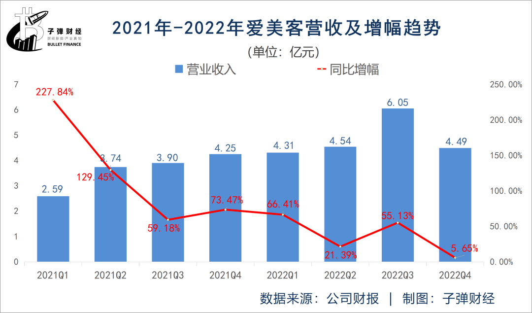 分季度来看,最近两年爱美客营收增幅也存在明显下降趋势。2021年第一季度,其营收同比增幅高达227.84%,而到了2022年第四季度,这一数据是5.65%。