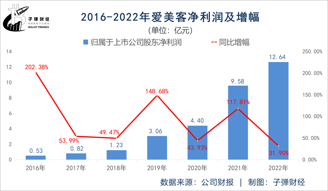 再把时间拉长来看,2022年爱美客实现净利润12.64亿元,同比增长31.9%,这一增幅创7年来新低。