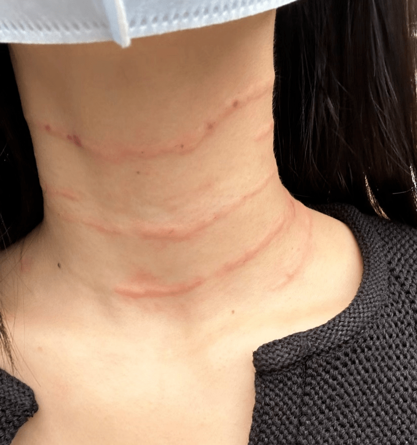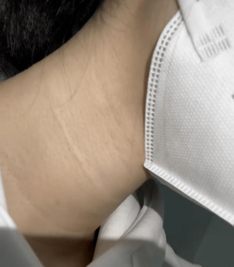 宋盛进一步表示,其中一个典型的情况是,反复使用嗨体后,有部分人会出现颈部纹路部位皮肤发白的情况,导致颈部出现一条尴尬的“白线”。