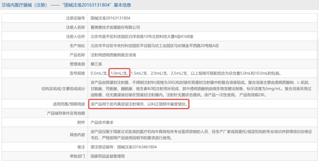 但实际上,上述系列产品对应的都是同一个批文,即国械注准20163131804,其中规定的使用范围/预期用途为“该产品用于真皮层注射填充,以纠正颈部中重度皱纹”。