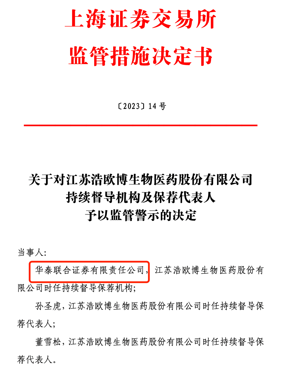 因此,上交所针对华泰联合证券以及持续督导保荐代表人孙圣虎、董雪松予以监管警示。
