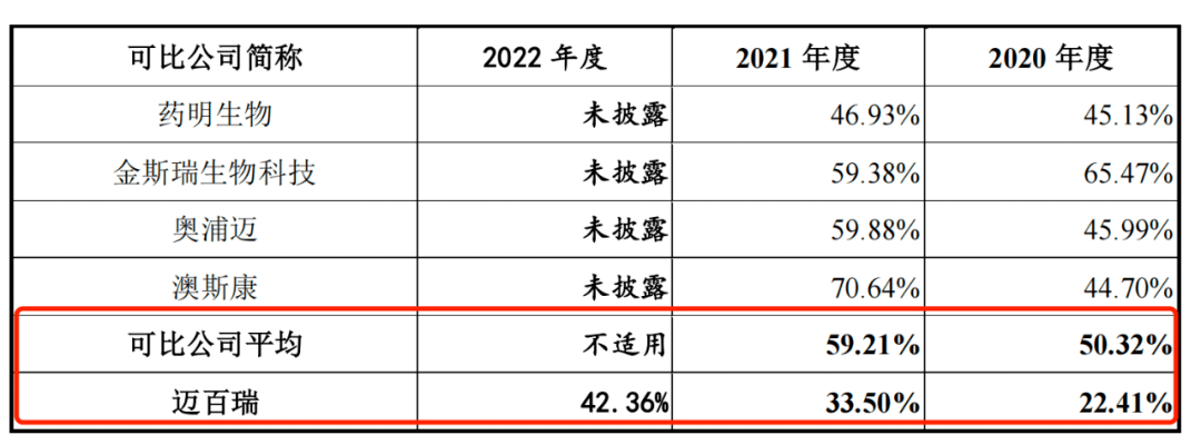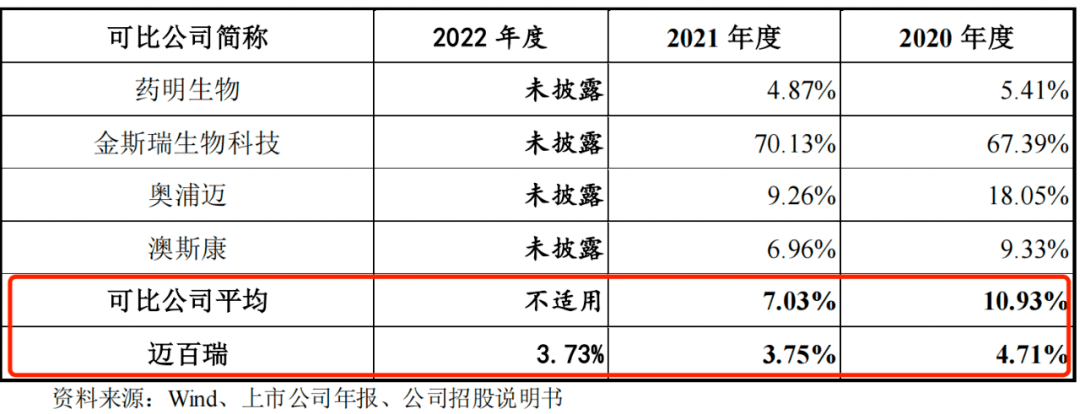 招股书显示,2020年和2021年迈百瑞的可比公司的毛利率平均值分别为50.32%和59.21%,虽然2022年同行公司的毛利率并未在招股书中披露,但是从2020年和2021年的数据来看,迈百瑞的毛利率远低于同行公司均值。