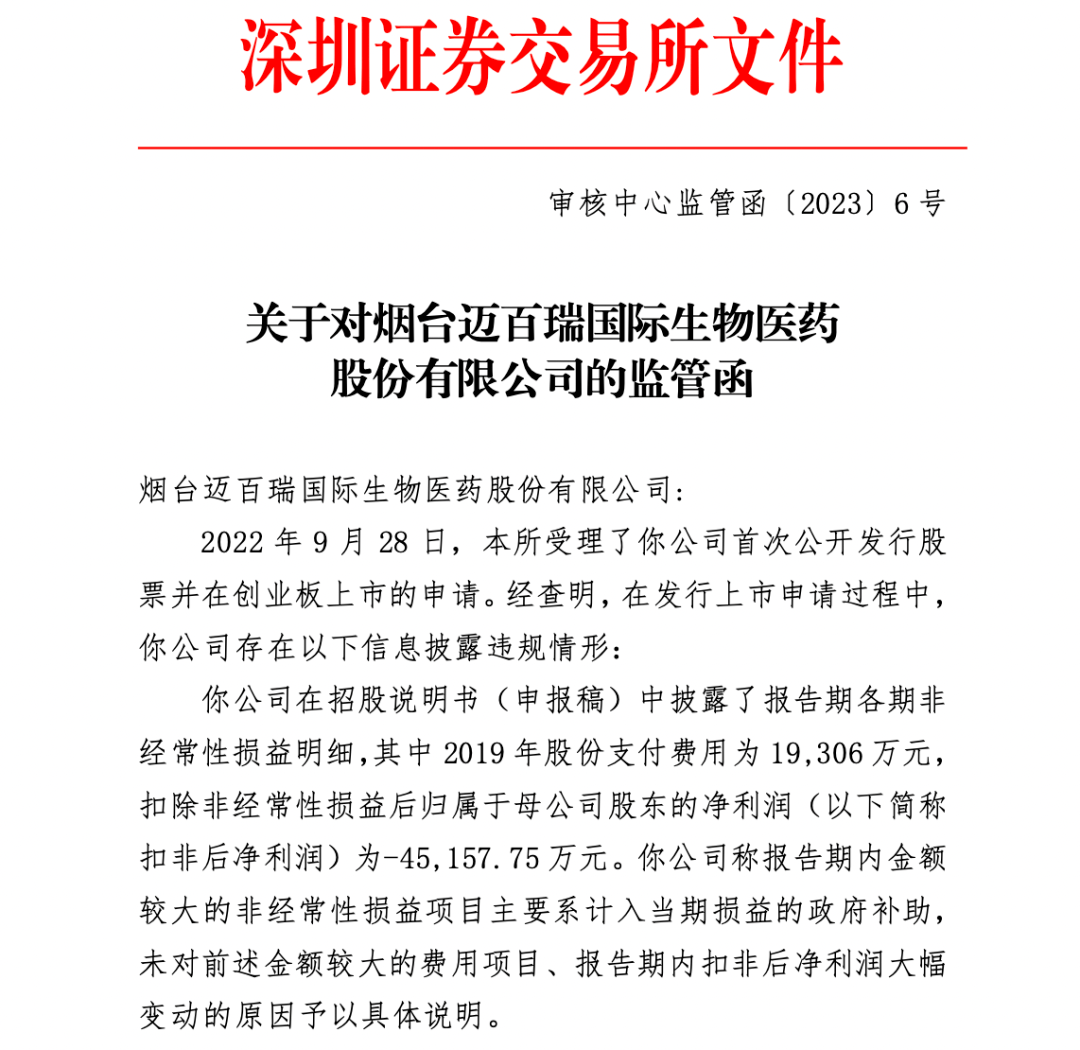 深交所公布的监管函显示,迈百瑞在招股说明书(申报稿)中将公司2019年股份支付费用“-19,306万元”错误披露为“19,306万元”,导致当年非经常性损益、扣非后净利润计算和披露错误。