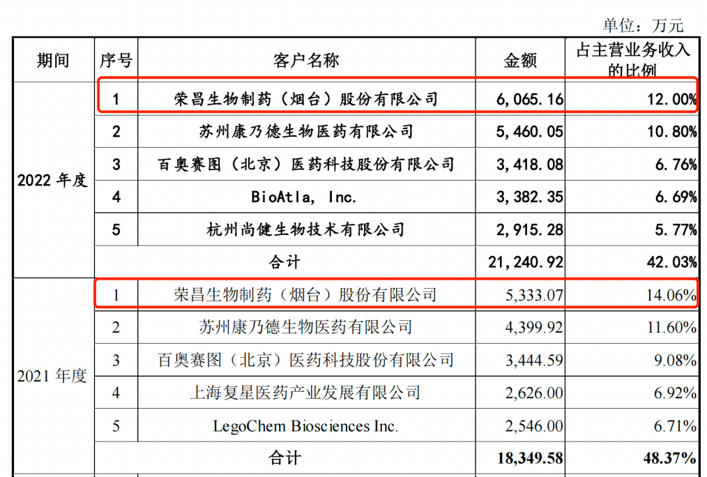 其中,关联方荣昌生物带来的主营业务收入占比分别高达5.26%、14.06%和12%。不仅如此,荣昌生物在2021年和2022年还是迈百瑞的第一大客户。