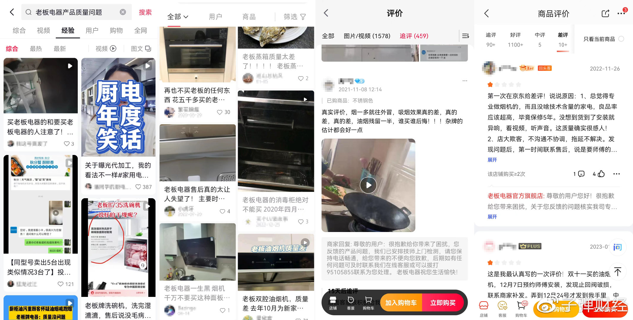 从消费者方面的反馈来看,老板电器的口碑信誉不佳。「界面新闻?子弹财经」注意到,无论是在抖音、小红书等社交平台,还是在天猫、京东等电商平台,抑或是在黑猫投诉等投诉平台上,都能看到关于老板电器产品质量问题的投诉。