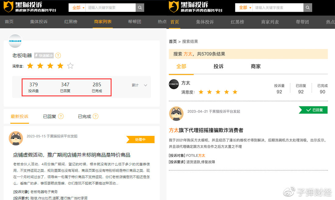 而且,老板电器对于消费者们的投诉似乎不够重视。「界面新闻?子弹财经」在黑猫投诉平台上发现,截至2023年5月16日,老板电器投诉完成率约为75%,低于方太的98%。