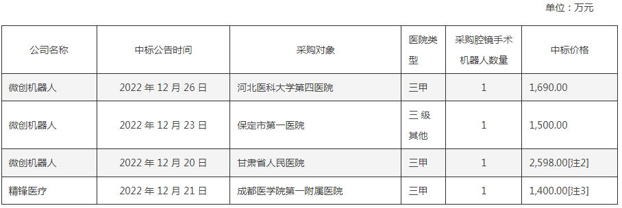 在问询函中,思哲睿表示2023年一季度有望实现设备销售收入。2022年思哲睿康多机器人SR1000中标黑龙江中医药大学附属第一医院腹腔内窥镜手术系统采购项目,中标价格为538万。
