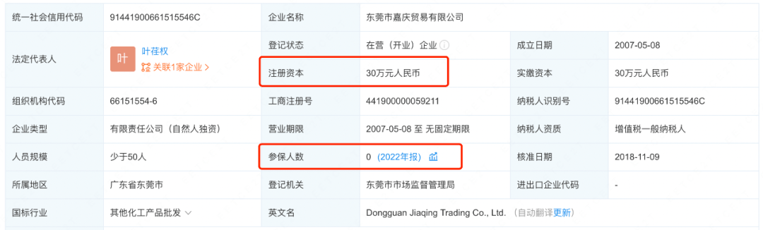 但令人怀疑的是,企查查显示,嘉庆贸易成立于2007年,注册资本仅有30万人民币,且公司的参保人数为0,很可能是一家“空壳”公司。