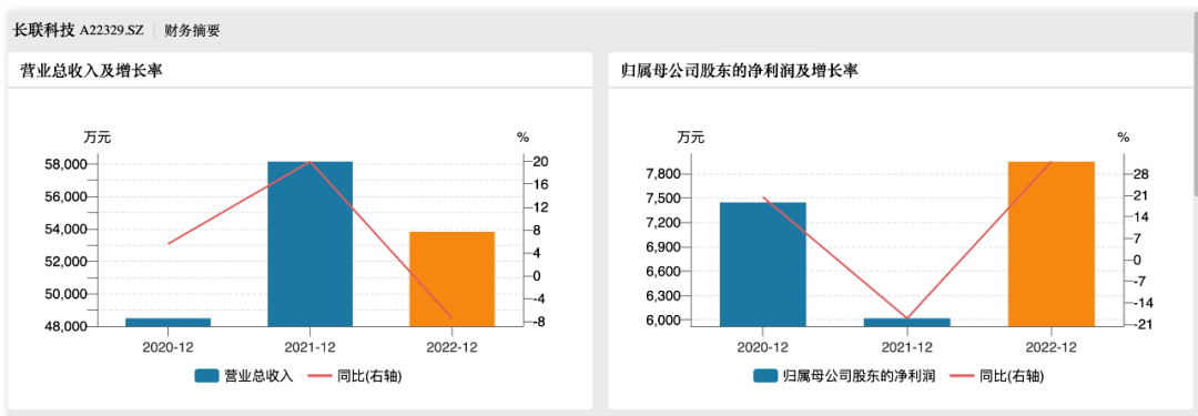 2020年—2022年(以下简称“报告期”),长联科技的营业收入分别为4.85亿元、5.81亿元和5.38亿元,同比增长率分别为5.55%、19.95%和-7.47%;同期归属母公司股东的净利润分别为7443.49万元、6019.37万元和7946.35万元,同比增长率分别为20.40%、-19.13%和32.01%。