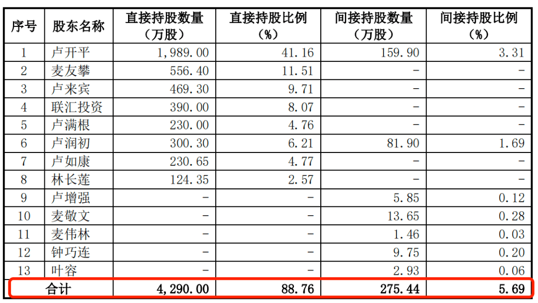 而卢氏家族对于长联科技的控制远不止于此。招股书显示,卢来宾、卢如康和卢满根分别持有长联科技的比例为9.71%、4.77%和4.96%。