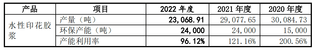 2020年和2021年,惠州长联的水性印花胶浆的产量分别为3.01万吨、2.91万吨,产能利用率高达200.56%、121.16%,而同期的环保产能分别为1.5万吨和2.4万吨,惠州长联的产量远超环保产能。