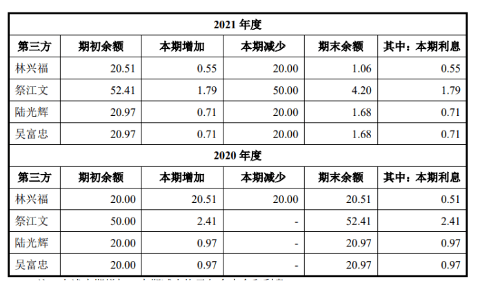 不仅如此,王荣正还会向朋友拆出资金。截至2019年末,林兴福、陆光辉、吴富忠合计拆出金额60万元尚未偿还,但在2020年,林兴福仍然从锡华科技拆出20万元资金,陆光辉、吴富忠遗留的拆出资金仍未偿还。