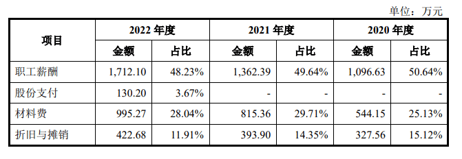 「界面新闻?子弹财经」注意到,2020年-2022年的3年时间内,锡华科技研发费用的一半均用来支付职工薪酬,仅有不到30%的资金用于材料。