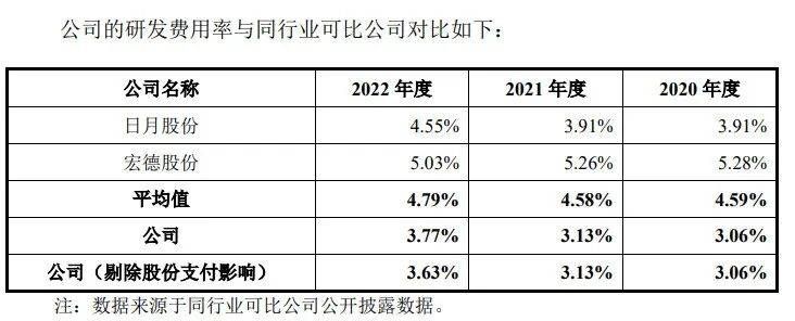 同期,日月股份的研发费用1.997亿元、1.84亿元、2.22亿元;研发费用率3.91%、3.91%、4.55%。宏德股份的研发费用3548.30万元、3978.51万元、4069.19万元;研发费用率分别为5.28%、5.26%、5.03%。