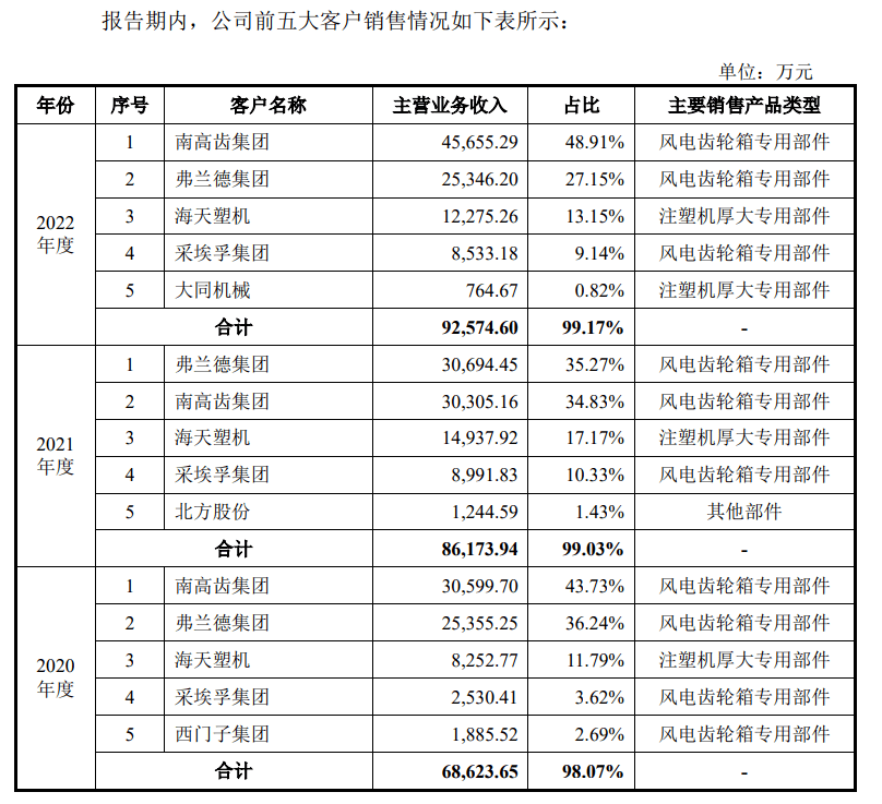 招股书显示,2020年-2022年,锡华科技前五大客户分别贡献了98.07%、99.03%、99.17%的主营业务收入。其中,行业巨头南高齿集团、弗兰德集团稳居前两大客户位置,连续3年保持超70%的贡献率。