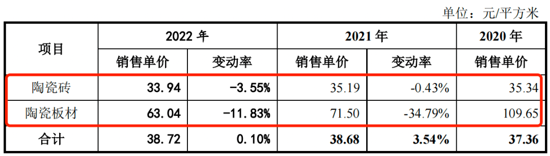 招股书显示,报告期内,新明珠陶瓷砖的销售单价分别为35.34元/平方米、35.19元/平方米、33.94元/平方米;陶瓷板材的销售单价分别为109.65元/平方米、71.50元/平方米、63.04元/平方米。