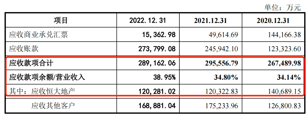 报告期内,新明珠的应收款项合计金额分别为26.75亿元、29.56亿元和28.92亿元,占营业收入的比例高达34.14%、34.80%和38.95%。其中,应收恒大地产的款项高达14.07亿元、12.03亿元和12.03亿元。