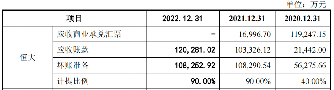 报告期内,新明珠对于恒大地产的坏账准备金额也快速走高,分别为5.63亿元、10.83亿元和10.83亿元,坏账计提比例高达40%、90%和90%。