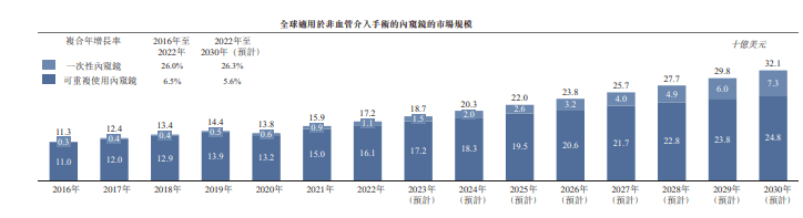 沙利文数据显示,2016年至2022年一次性内窥镜市场规模从3亿美元增长至11亿美元,预计全球一次性内窥镜市场规模将从2023年的15亿美元增长至至2030年的73亿美元。
