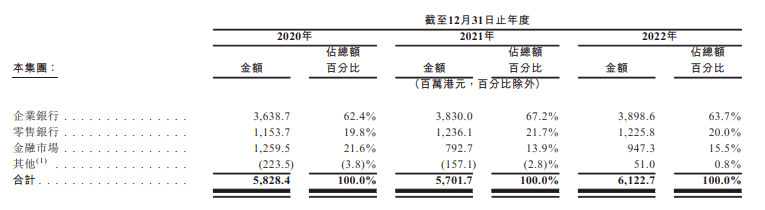 从业务分类来看,公司业务分为企业银行业务、零售银行业务以及金融市场业务。其中企业银行业务为公司核心业务,2022年公司企业银行业务实现营收38.99亿港元,占公司收入比例为63.7%。